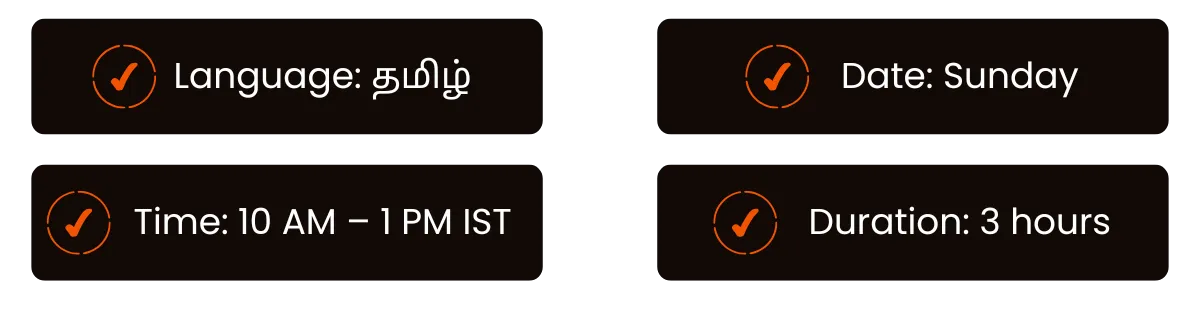 You’ll receive worksheets, templates, frameworks, and key takeaways — உங்க digital product journey தொடர helpful ஆக இருக்கும் essential resources எல்லாம் கிடைக்கும்.
